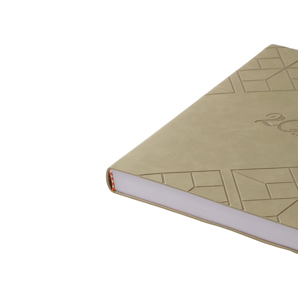 Descrição: Agenda 2026 de couro sintético com abas mensais e marcador de página em cetim. Contém folhas para dados pessoais, calendários 2026 à 2028, planejamento 2026, DDI, página de conversões e páginas de contatos.