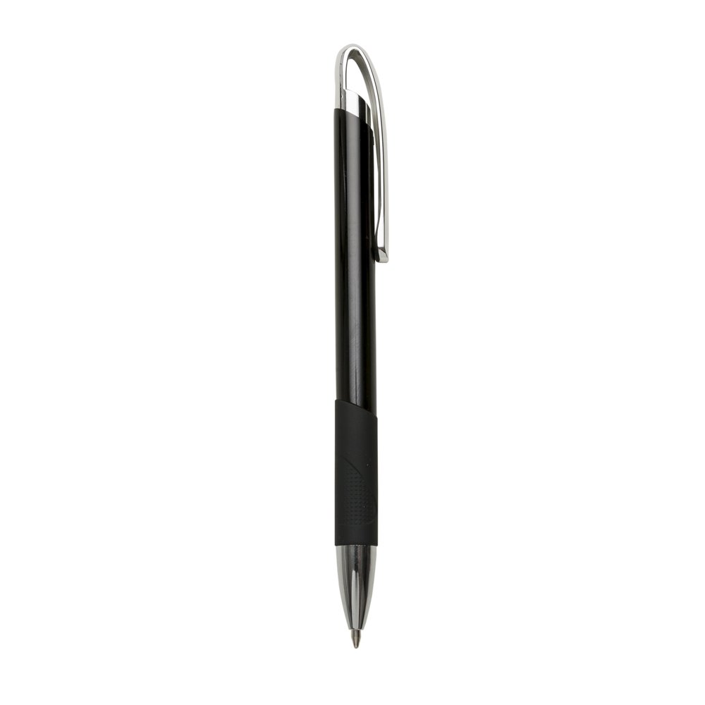 DescriçãoCaneta metálica com detalhe emborrachado, carga esferográfica azul e acionamento por clique.