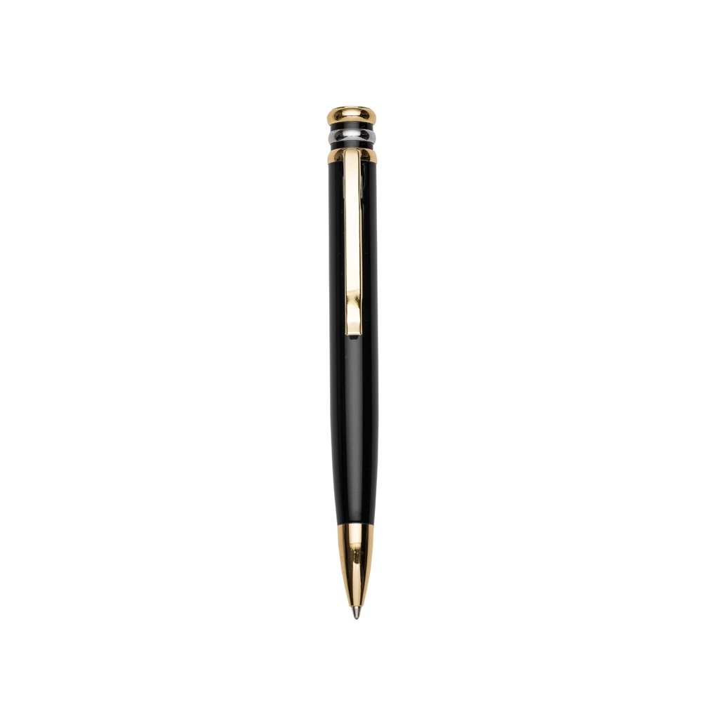 DescriçãoCaneta metal inteira colorida com detalhes dourado. Clip metal dourado com 3 anéis, sendo dois dourados e o central prata. Ponteira dourada, aciona por giro.