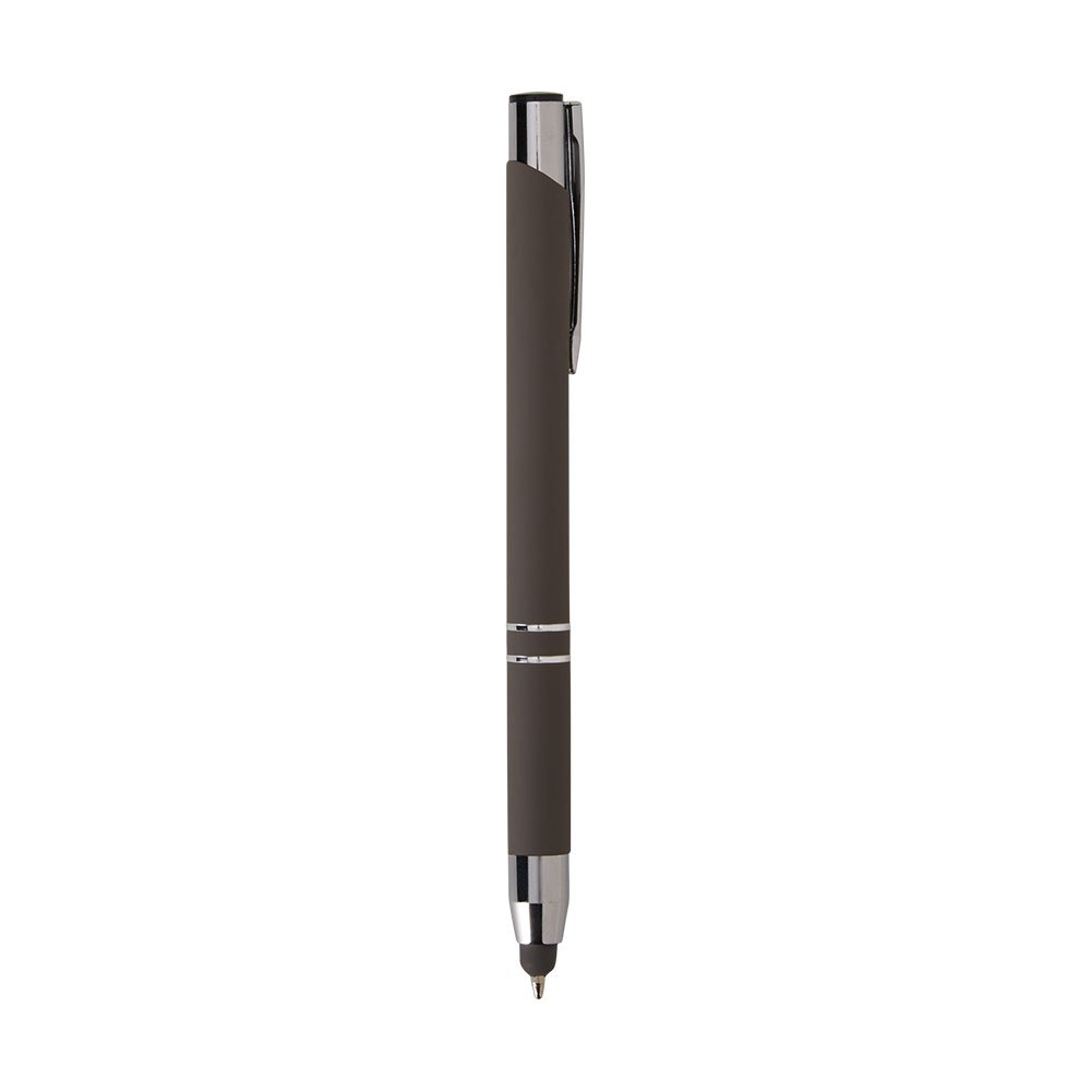 Descrição: Caneta esferográfica com carga azul de 1.0mm e acionamento por clique. De construção metálica, também possui ponteira emborrachada que permite seu uso como uma caneta touch para interação com dispositivos de tela sensível ao toque.