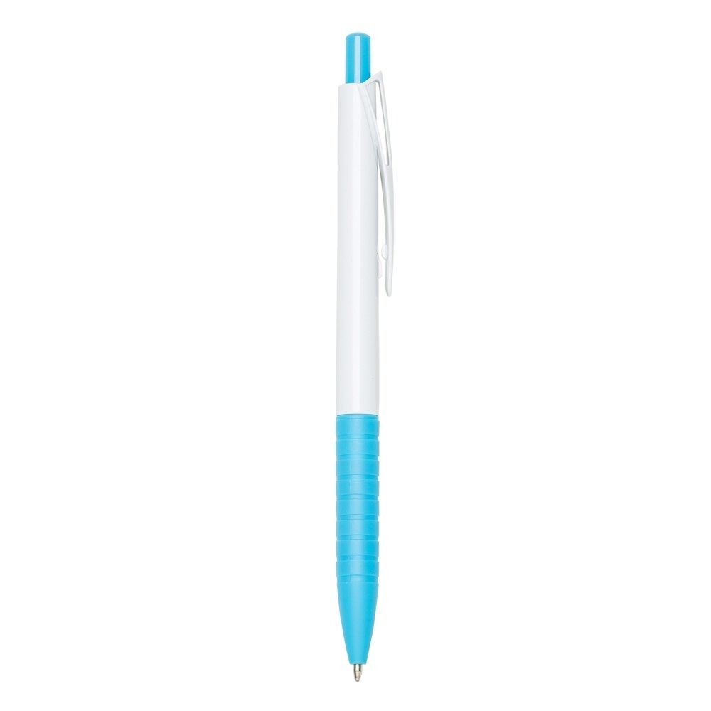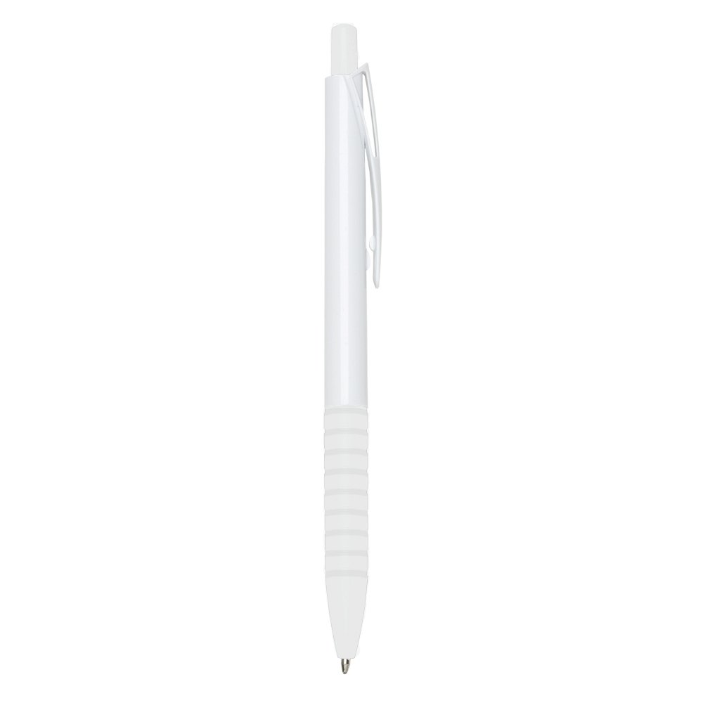 DescriçãoCaneta plástica com carga esferográfica azul e acionamento por clique.