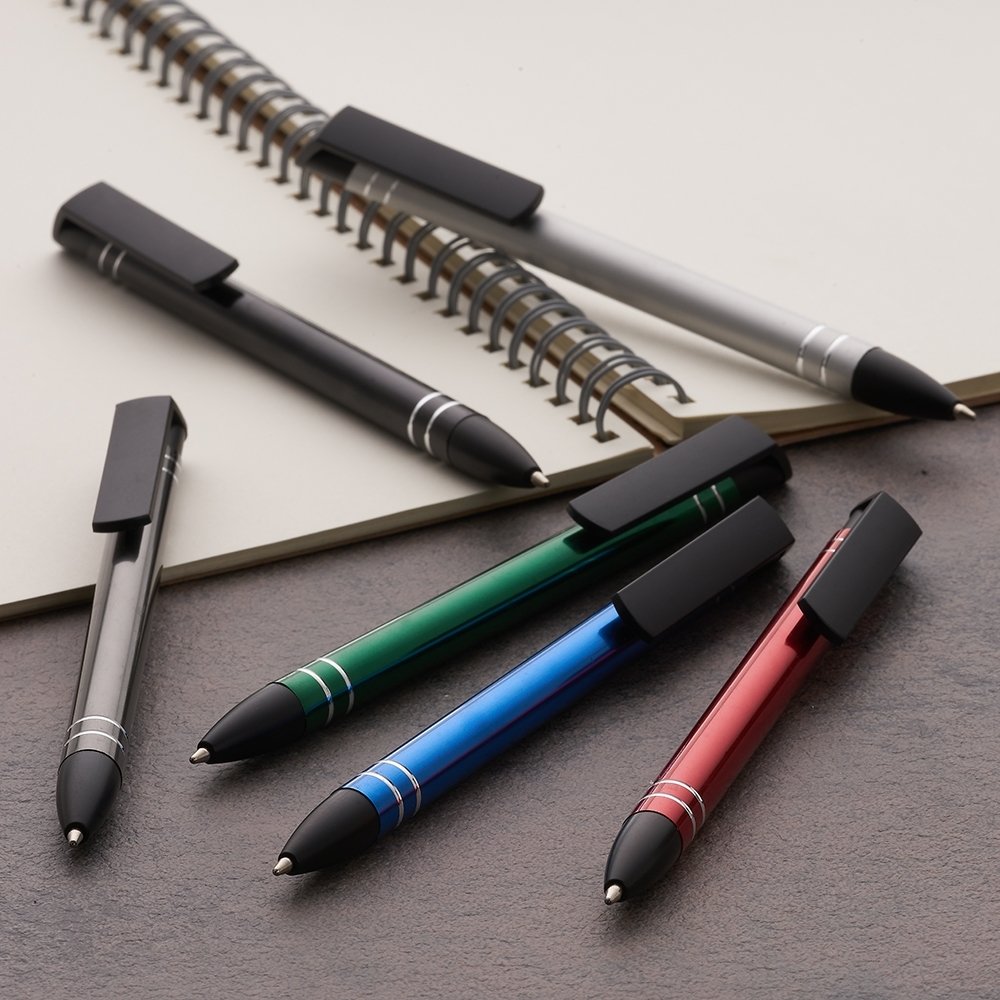 DescriçãoCaneta semimetálica com carga esferográfica azul e acionamento por clique.