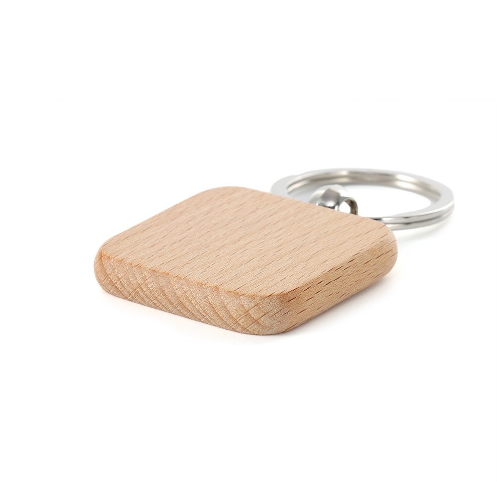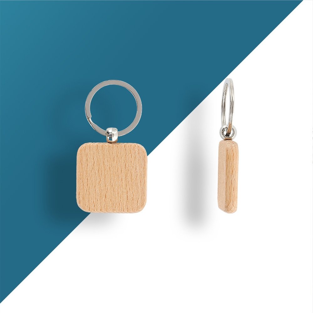 DescriçãoChaveiro em madeira com formato quadrado.