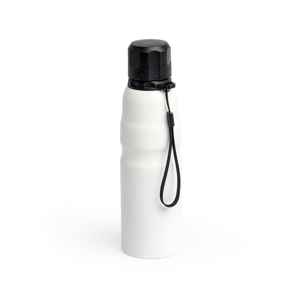 DescriçãoGarrafa inox 800ml com tampa plástica rosqueável e cordão para transporte.
