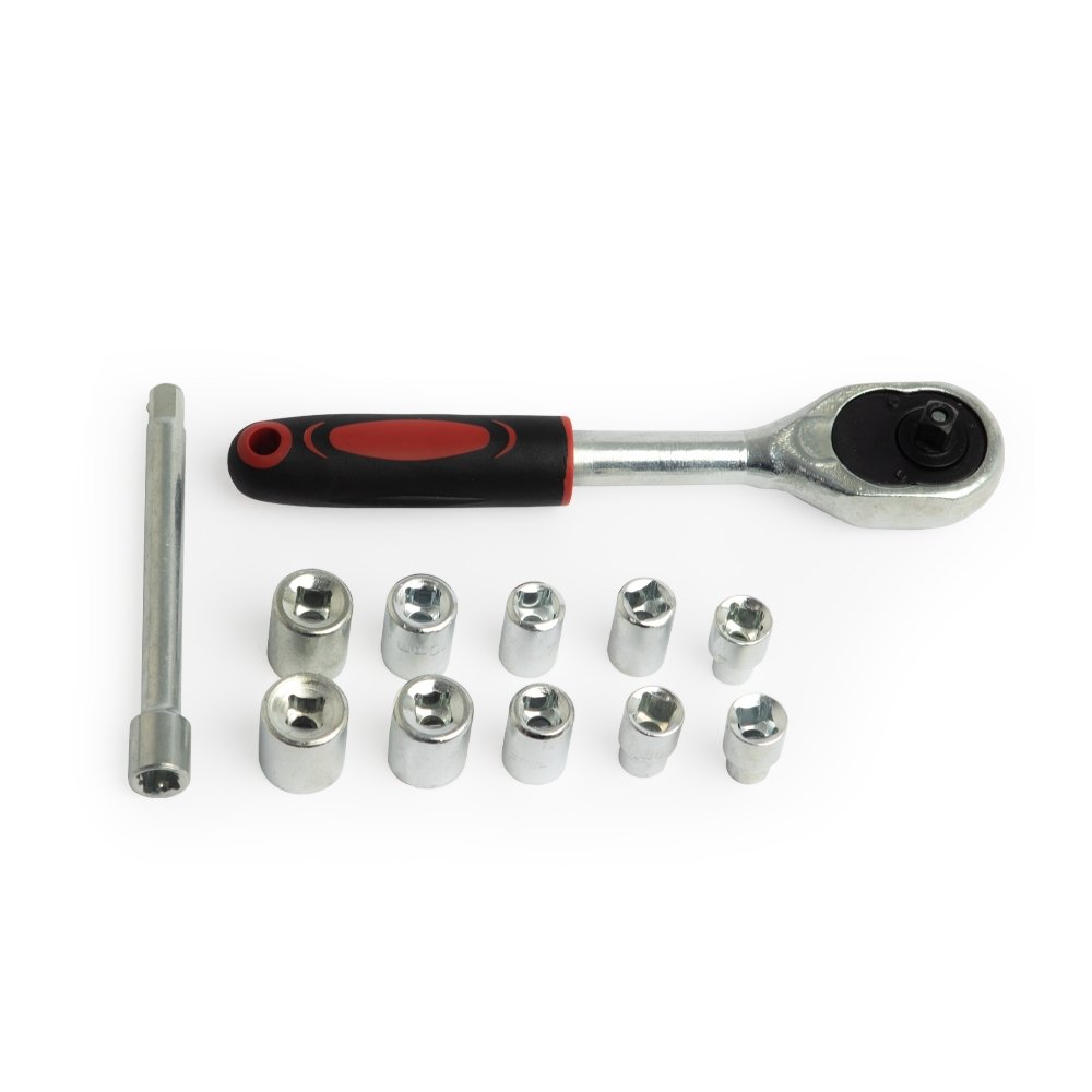 DescriçãoKit ferramenta com 12 peças em estojo plástico. Contém: 1 chave catraca, 1 chave extensora e 10 soquetes.