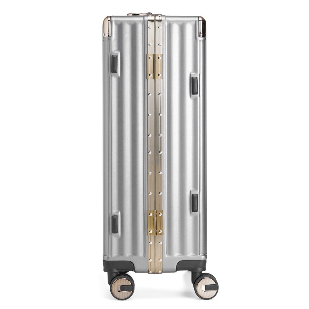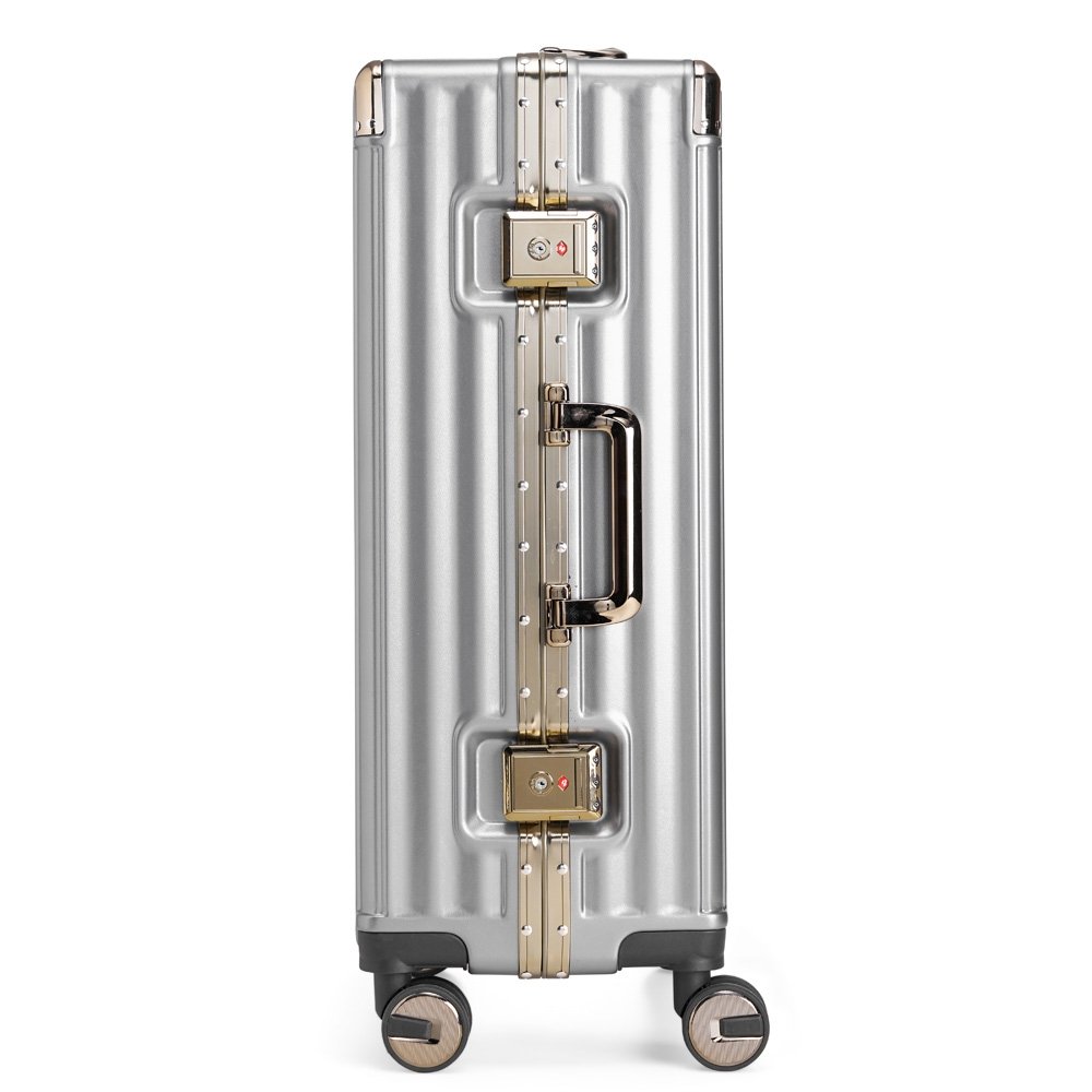 DescriçãoMala de viagem 68 litros feita em plástico com acabamento em alumínio, contém cadeado numérico TSA. Compartimentos internos com bolso telado, bolso plástico para itens molhados e cinta compressora para roupas. A mala possui duas alças de mãos, puxador retrátil com regulagem de tamanho, suporte porta bolsa, quatro rodinhas 360º e apoios laterais.