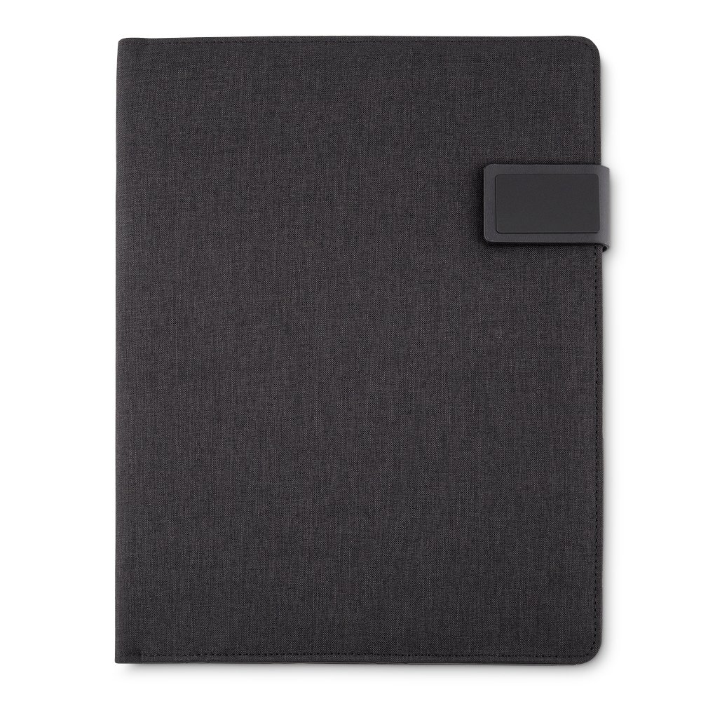 DescriçãoPasta convenção de tecido sintético, possui fecho magnetizado com plaquinha para personalização em preto fosco. Parte interna com compartimento grande para arquivar documentos,três divisórias elásticas, duas divisórias para celular e cartões, suporte elástico para caneta e bloco com aproximadamente 20 folhas brancas pautadas com dias do mês na área superior.