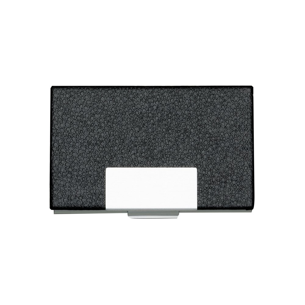 DescriçãoPorta cartão em couro sintético com detalhes em prata. Possui chapa central em metal para gravação, parte interna e traseira em alumínio.